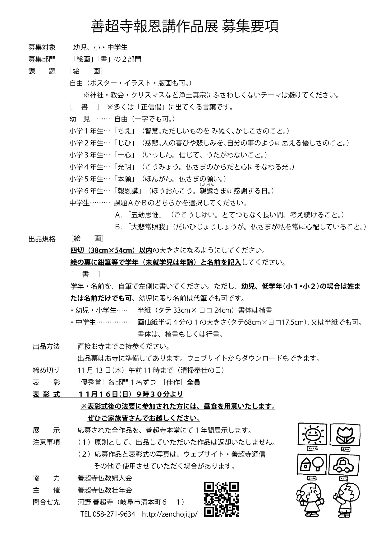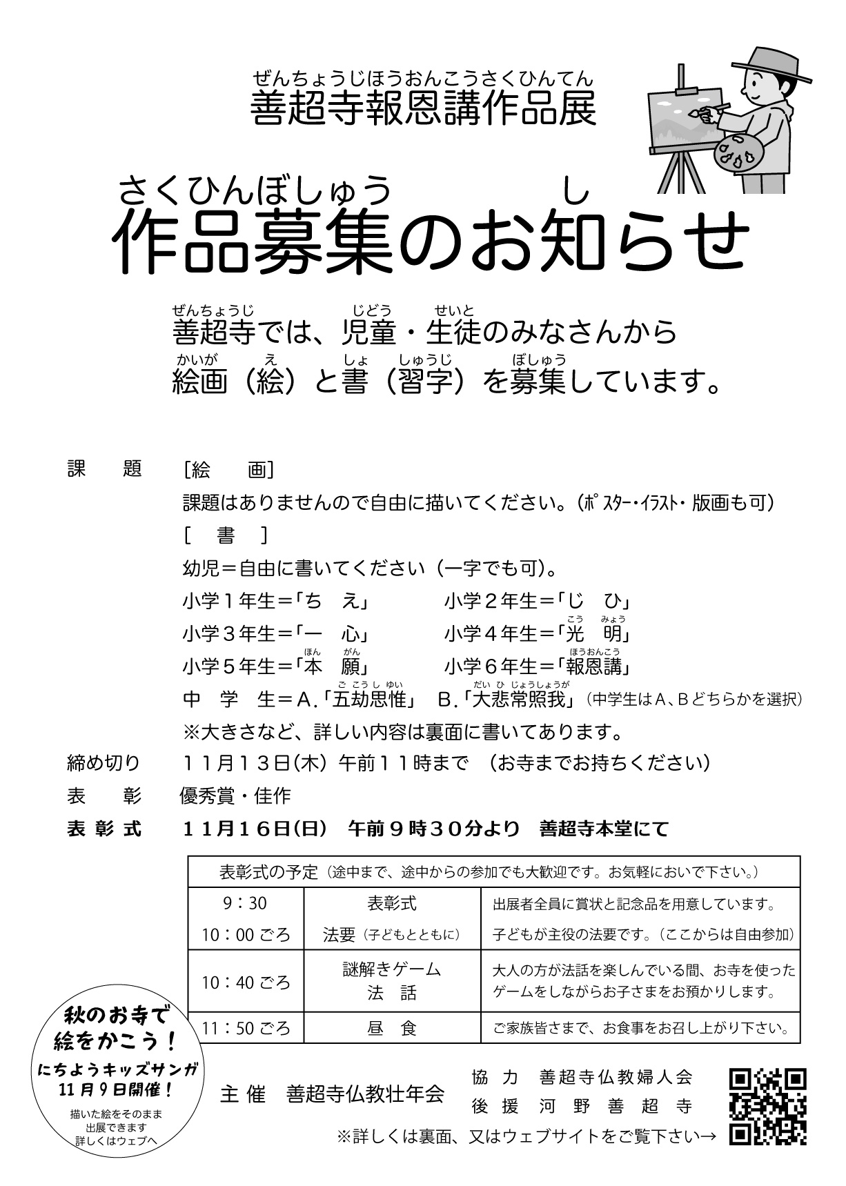 今年も報恩講をお勤めします。これに合わせて、お子さんの素敵な絵や書道をぜひ善超寺本堂に飾らせてください。たくさんの出展お待ちしています。