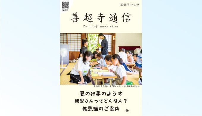 ホーム善超寺通信 善超寺通信46号〈夏の行事のようす〉 2025年10月22日 SHARE ポスト シェア はてブ LINE 最新の善超寺通信ができました 善超寺通信の49号が完成しました。今回は、 夏の行事のようす 親鸞さんってどんな人? 報恩講のお知らせ などの内容です。電子版のURLはこちらです。門信徒の皆様には郵送でもお送りいたします。